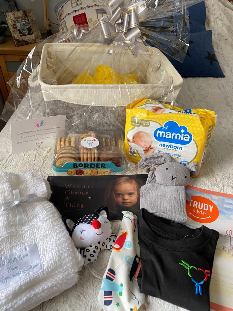 We would love to welcome your baby with a New Baby Welcome Basket. In it they will receive hand knitted blanket, Down’s Syndrome Scotland T-shirt, bib, rattle, Trudy and Me book, Wouldn’t Change a Thing book, muslin and nappies and many more goodies! Just contact our helpline on 0300 030 2121 or email familysupportservice@dsscotland.org.uk to request yours.